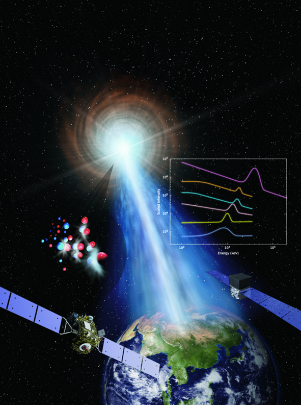 Figure 1: Illustration of the observation of the brightest ever gamma-ray burst (GRB 221009A) by GECAM-C and Fermi/GBM, leading to the discovery of gamma-ray line up to 37 MeV. This work was published as a cover story in Science China Physics, Mechanics & Astronomy.