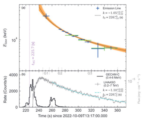A research group led by the Institute of High Energy Physics (IHEP) of the Chinese Academy of Sciences (CAS) recently reported their discovery of the gamma-ray line up to 37 million electron-volts from an extremely bright gamma-ray burst, which represents the highest energy spectral line features emitted by celestial objects in the universe. In addition, they found that the gamma-ray line evolves as a power-law function of time, providing critical clues to unveil the mystery of the line. Their paper was published as a cover story in Science China Physics, Mechanics & Astronomy on July 25.
