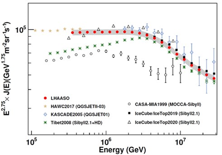 Fig 1. The “knee” feature of the cosmic ray all-particle energy spectrum, with the red dots representing the precise measurements from the LHAASO experiment.