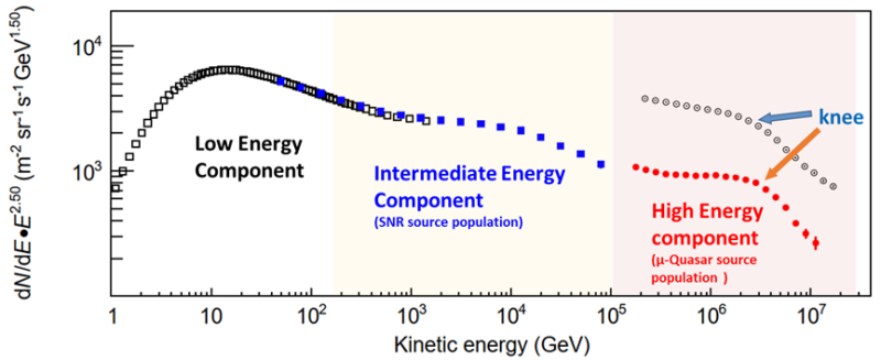 LHAASO’s new findings,together with the low-energy component measured by the space-borne AMS-02 experiment and the intermediate-energy component measured by the space-borne DArk Matter Particle Explorer (DAMPE) experiment,revealed the existence of multiple accelerators within the Milky Way,with each possessing its own unique acceleration capability and energy range. The “knee” represents the acceleration limit of the sources responsible for generating the high-energy component.