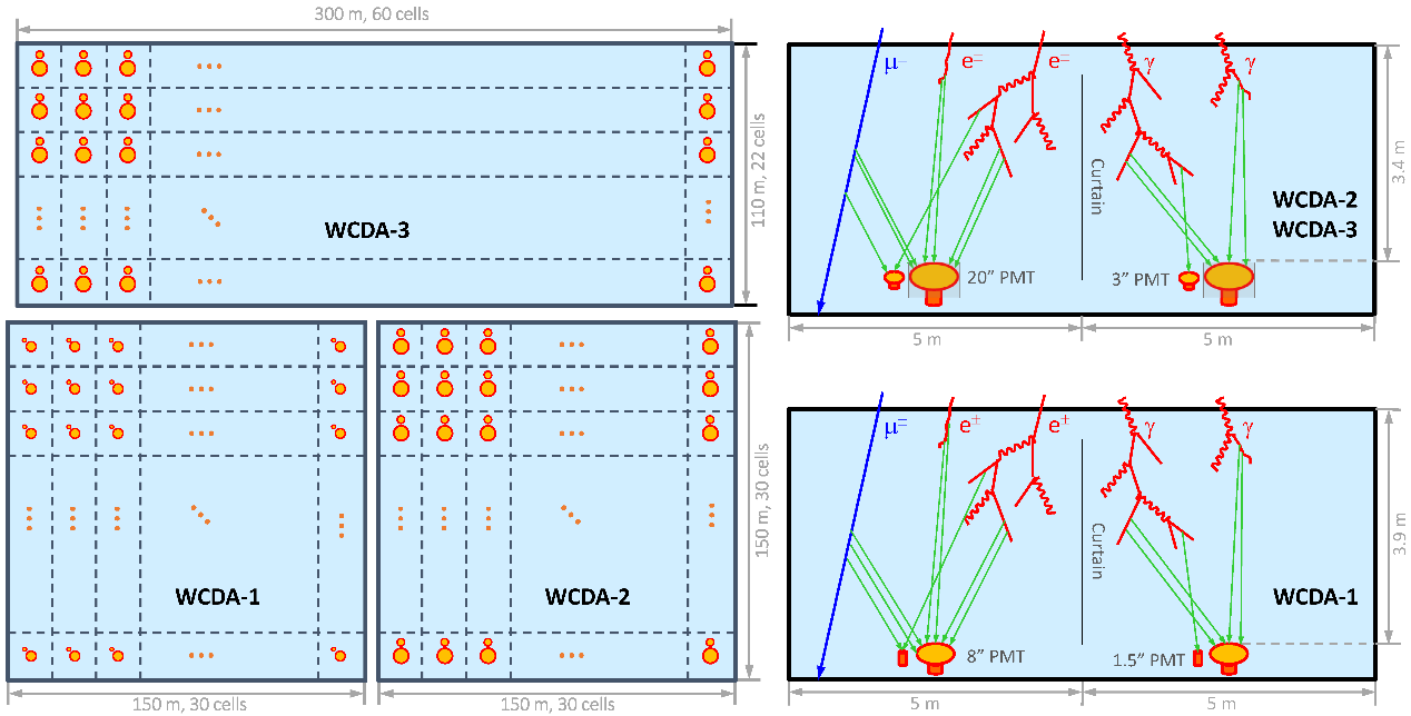 图5:水切伦科夫探测器阵列示意图。装置由3个大型水池构成,水深4.5米。6240个光敏探头与周围的水体由黑色隔光帘分成3120个单元。