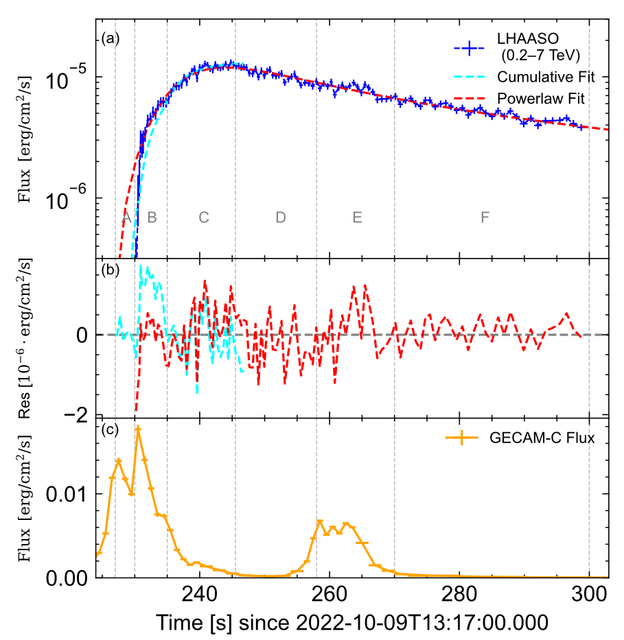 图2: 研究团队发现GECAM-C测量的瞬时辐射(橙色)与LHAASO测量的余辉辐射(蓝色)存在紧密关联[1]