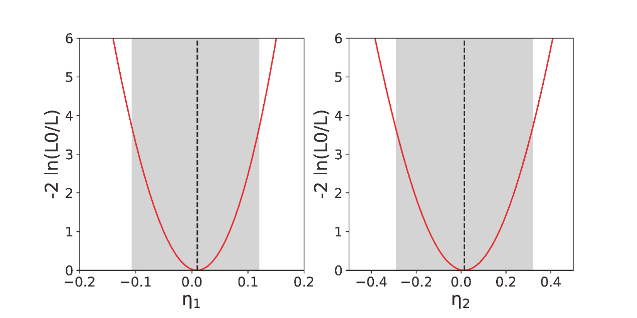 图2:LHAASO给出的量子引力能标参数1、2的95%置信区间。1阴影范围对应于一阶量子引力能标下限1.11020 GeV(超光速情景)与1.01020 GeV(亚光速情景);2阴影范围对应于二阶量子引力能标下限7.11011 GeV(超光速情景)与6.91011 GeV(亚光速情景)。