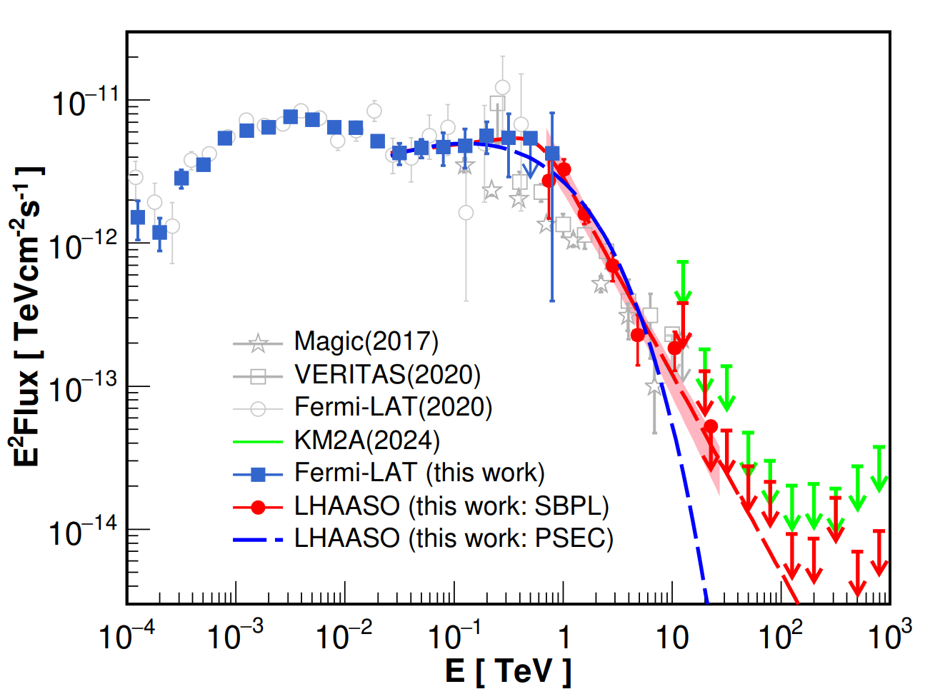 国家重大科技基础设施高海拔宇宙线观测站(LHAASO,中文简称“拉索”)以11倍显著性探测到著名的仙后座A超新星遗迹Cassiopeia A(Cas A),并首次观测到其伽马射线能谱在TeV处呈现独特的鼓包结构,解释了超新星遗迹激波加速产生宇宙线理论与前期TeV伽马射线观测的矛盾。该成果于2025年3月20日发表在《The Astrophysical Journal Letters》(天体物理学杂志通讯)。