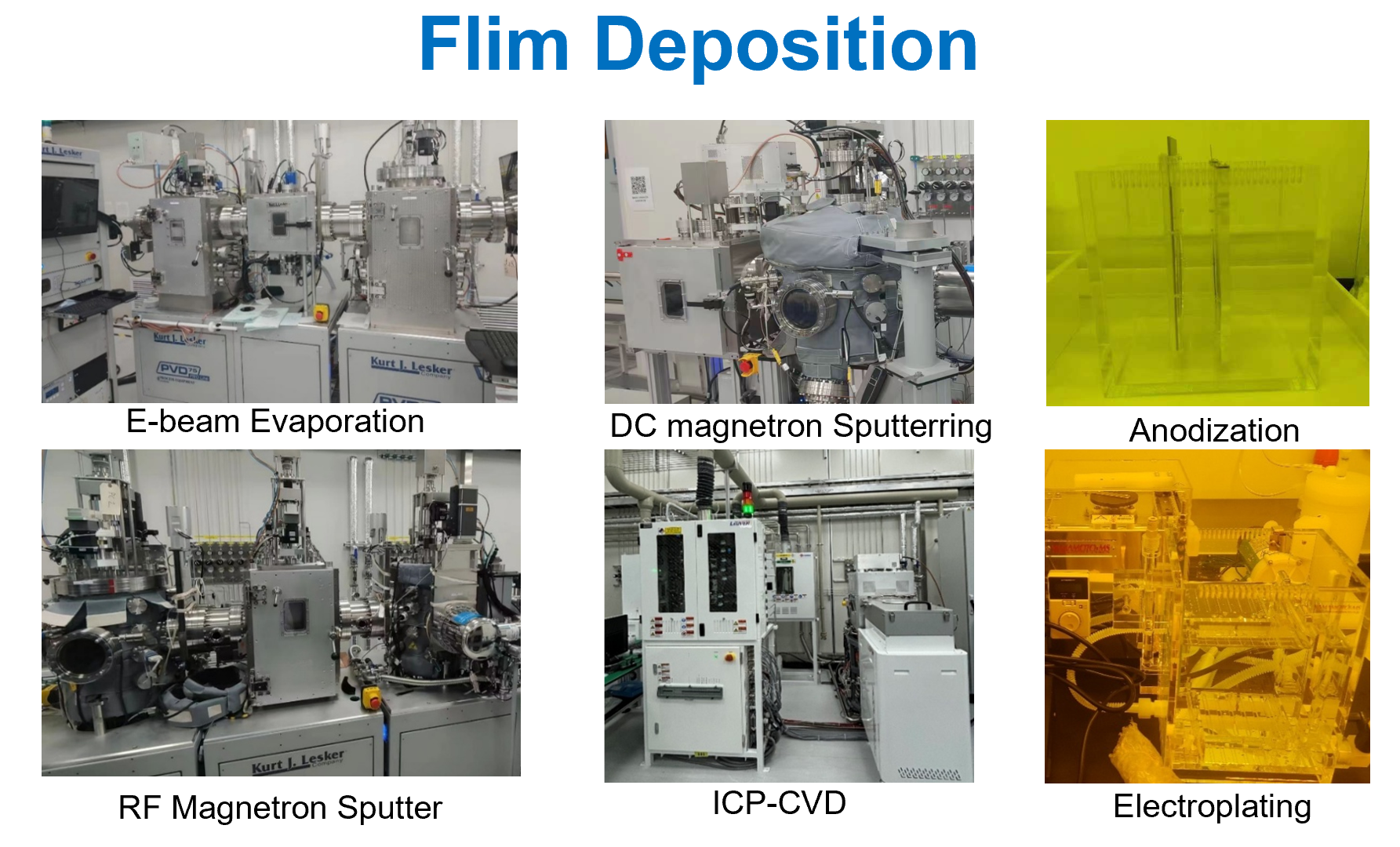 位于千级洁净间与万级洁净间,包括6台磁控溅射机、1台电子束蒸发台、1台感应耦合等离子体-化学气相沉积设备(ICP-CVD),部分设备见图2,可以沉积绝缘介质与多种超导金属薄膜,比如氧化硅、氮化硅、Nb、Al、AlMn合金、Ti、Pd、Au、Pd、PdAu、、Ta、In、Mg等等。支持6英寸以及以下尺寸的镀膜工艺,薄膜厚度不均匀度均≤5%。另有3套电化学镀槽,位于湿法间的电化学台,可以开展电镀与阳极电镀;