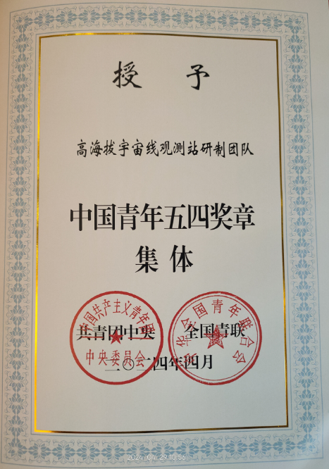 4月29日,第28届“中国青年五四奖章”评选结果揭晓,高海拔宇宙线观测站研制团队荣获“中国青年五四奖章集体”。