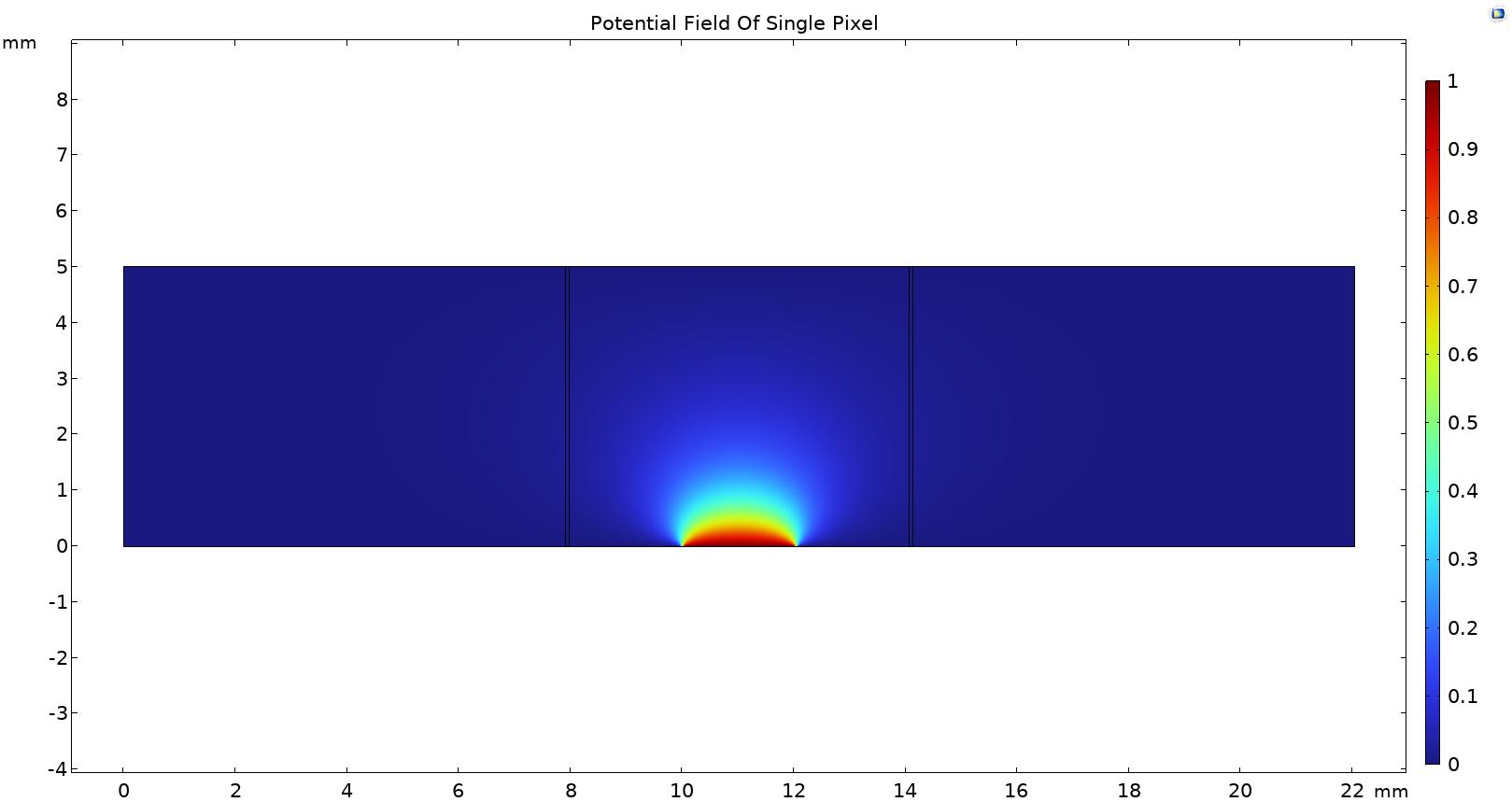 本研究通过结合有限元方法与蒙特卡洛模拟,系统分析了CdZnTe探测器在辐射相互作用后电荷产生、输运、俘获、扩散及收集的全过程。该模型重构了探测器内部任意空间位置辐射事件在像素化阳极上诱导产生的信号。基于此框架,重点研究了阳极邻近区域的能量分辨率劣化现象,并在不考虑电子噪声的条件下评估了通过横向位置分辨率进行能量响应校正的可行性与有效性。通过求解伴随方程,分析了横向位置度量参数"相邻像素比"在不同深度和水平位置的分布特征。结果表明除阳极0.5 mm范围内外,绝大多数区域中横向位置分辨能力基本不受相互作用深度影响。以0.5 mm三维空间分辨率为例,对部分近阳极相互作用事件进行了能谱校正模拟。在典型探测器配置(2毫米像素间距、5毫米晶体厚度)下,横向位置甄别与能量校正可优化特定区域的能量响应,同时提升能量分辨率和有效灵敏体积。然而,在阳极邻近区域获取亚像素级位置分辨率仍存在挑战:权重电位分布导致负极性信号幅值远超正极性信号,且部分事例会直接输出瞬态负信号。后续研究需升级电子读出系统,以分析此类双极性信号响应。