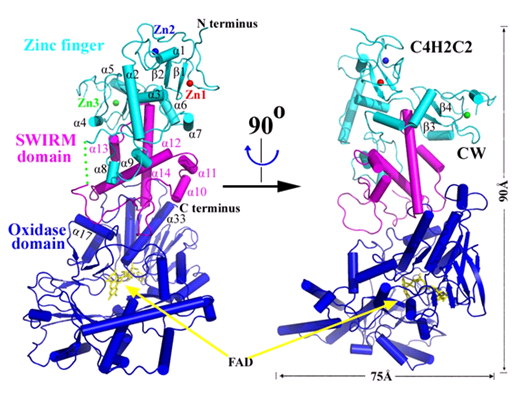 该研究利用北京同步辐射装置(BSRF)解出了的2.13 Å分辨率的 LSD2的复合物晶体结构。LSD2包括三个结构域,分别命名为N端的锌指结构域(Zinc-finger domain)、中间的SWIRM结构域和C端的胺氧化酶结构域(Amine oxidase domain,AOD),这三个结构域紧密堆积在一起形成靴子状结构。胺氧化酶结构域的活性中心空腔足够容纳组蛋白H3尾巴的数个氨基酸残基,但不能辨别H3K4的不同甲基化状态。N端的锌指结构域由一个全新拓扑结构的C4H2C2型锌指结构和一个特殊的CW型锌指结构组成。C4H2C2型锌指结构表面富含正电荷,可能与DNA或其它富含负电荷的蛋白质发生相互作用而有利于LSD2对H3K4me1/2进行去甲基化。CW型锌指结构不同于以往发现的其它CW型锌指结构。事实上,结构分析表明锌指结构域--SWIRM结构域--胺氧化酶结构域之间形成的相互作用网络对于保持LSD2活性构象和去甲基化酶活性是必需的。这些结果揭示了通过在LSD2三个结构域之间接力传递的相互作用来实现锌指结构域远程调控其去甲基化酶活性的新机制,对于阐明LSD2的调控机制及功能,癌症的治疗提供了新的思路。