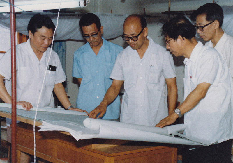 谢家麟、方守贤先生和设计人员一起研究对撞机的工程设计