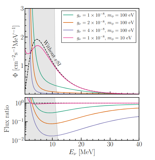 图1:中微子自相互作用对 DSNB 能谱的影响。上图:中微子通量。黑色虚线曲线表示自由传播的DSNB通量;彩色实线表示受中微子自相互作用影响的DSNB通量。下图: 中微子通量比值。灰色阴影区域表示来自反应堆中微子的背景。