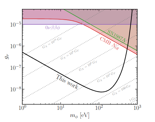 图2: 中微子自相互作用在低质量区域的参数空间。未来中微子探测器对 DSNB 的观测可使当前已知的限制(彩色区域)大幅提升若干个数量级(黑线)。