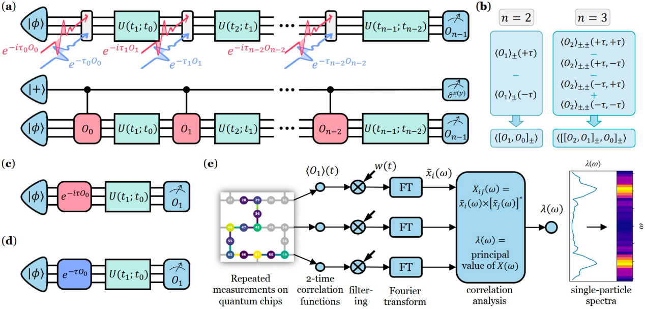 算法的核心计算思路与流程:1. n点关联函数可分解为算符对易子与反对易子的线性组合。 2. 对易(反对易)子对应算符实时(虚时)演化的期望值导数;期望值由线路(a)测量。 3. 利用参数移位规则(Parameter-Shift Rule),实现期望值导数的精确计算;如图(b)所示。