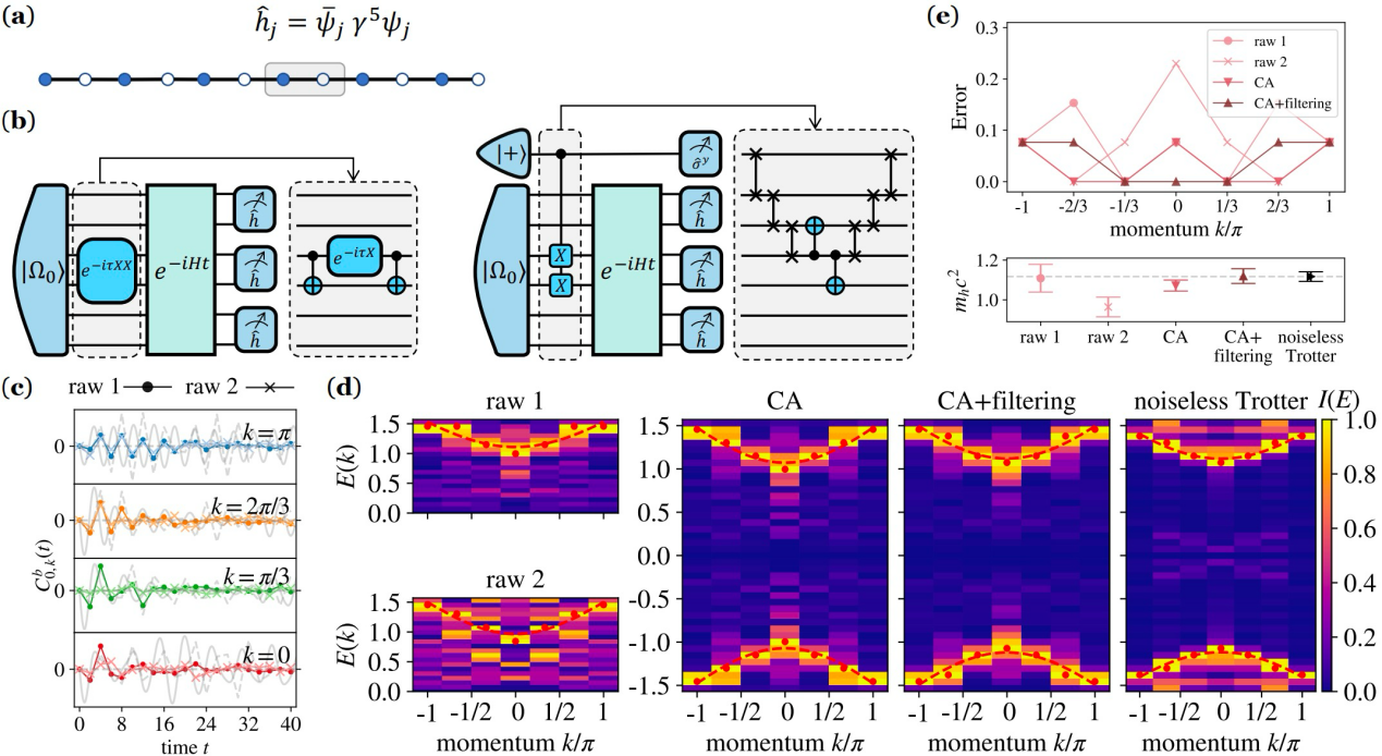 本项工作提出了一套仅利用目标系统自身幺正演化的计算 n 点关联函数的新方法,消除了对辅助量子比特和受控门操作的依赖,显著降低了硬件连接度的要求,使 n 点关联函数的测量在真实量子平台上更加可行。其核心思想是将关联函数拆解为对易子与反对易子的组合,并分别对应到量子线路上算符的实时与虚时演化。研究团队利用至多 12 个超导量子比特,演示了对施温格模型强子谱以及横场伊辛模型非时序关联函数(OTOC)的计算。通过引入基于经典信号处理(结合信号滤波与关联分析)的误差缓解方案,研究团队成功提取到了相对误差为0.18%的强子质量,并利用OTOC展示了横场伊辛模型可积性的相关特征。