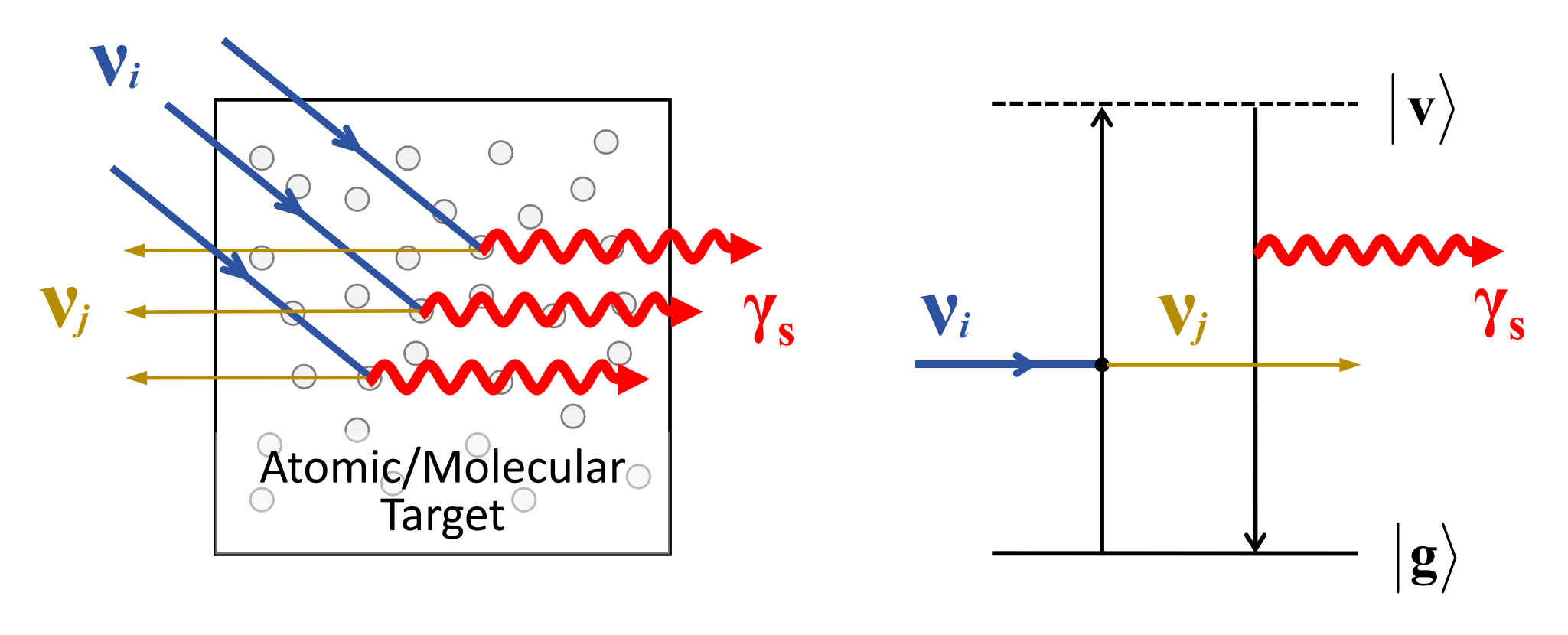 图:宇宙背景中微子与原子或分子系统的相干散射诱导后者产生参量荧光效应,其中
