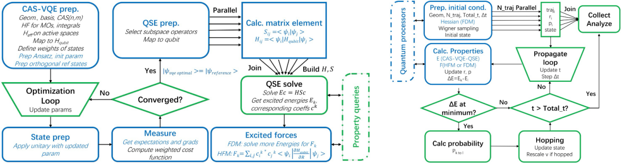 混合量子-经典非绝热动力学算法架构:左图为电子结构计算流程图;右图为扩展LZSH非绝热分子动力学流程。
