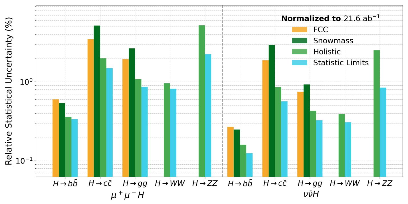 基于环形正负电子对撞机(CEPC)在240 GeV能区运行并积累21.6 ab⁻¹积分亮度的运行情场景,研究团队对多种希格斯强子衰变模式的测量进行了系统模拟研究。结果表明,在Z(μ⁺μ⁻)H和Z(νν)H两类典型产生道中,H→bb̄、cc̄、gg、WW→4q和ZZ→4q等衰变模式的相对统计精度可达到0.16%至5.21%。与此前研究(2021年Snowmass物理研究)相比,holistic approach可将多个关键衰变道的测量精度提升约2至4倍,其中部分结果已接近理论统计极限。