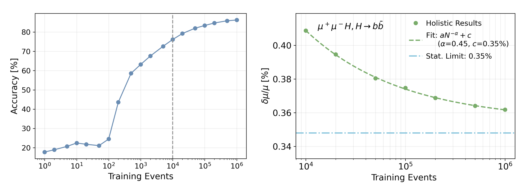 图2, 研究观察到的Scaling 行为:随着训练数据集的增加,事例区分性能变化(左图)以及关键物理测量预期精度的变化。