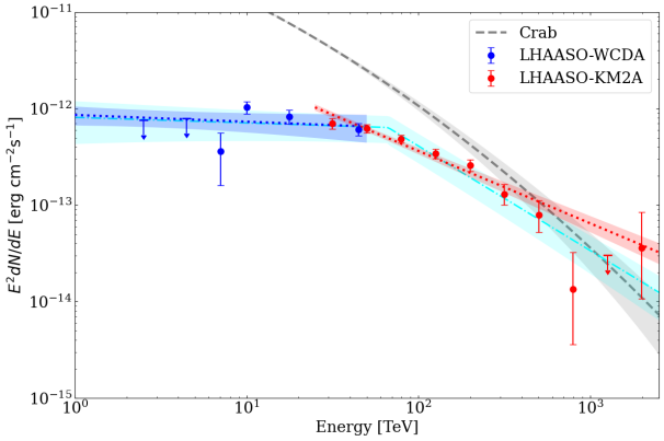 图2 PSR J1849-0001区域伽马射线的能谱(即光子数量随能量的变化图),蓝色点和红色点分别表示拉索两个子阵列的测量结果。作为参照,灰色虚线代表蟹状星云的能谱。两者在PeV能量附近流量相当,而PSR J1849-0001比蟹状星云距地球的更远,可推出其PeV光度超过蟹状星云高出约一个数量