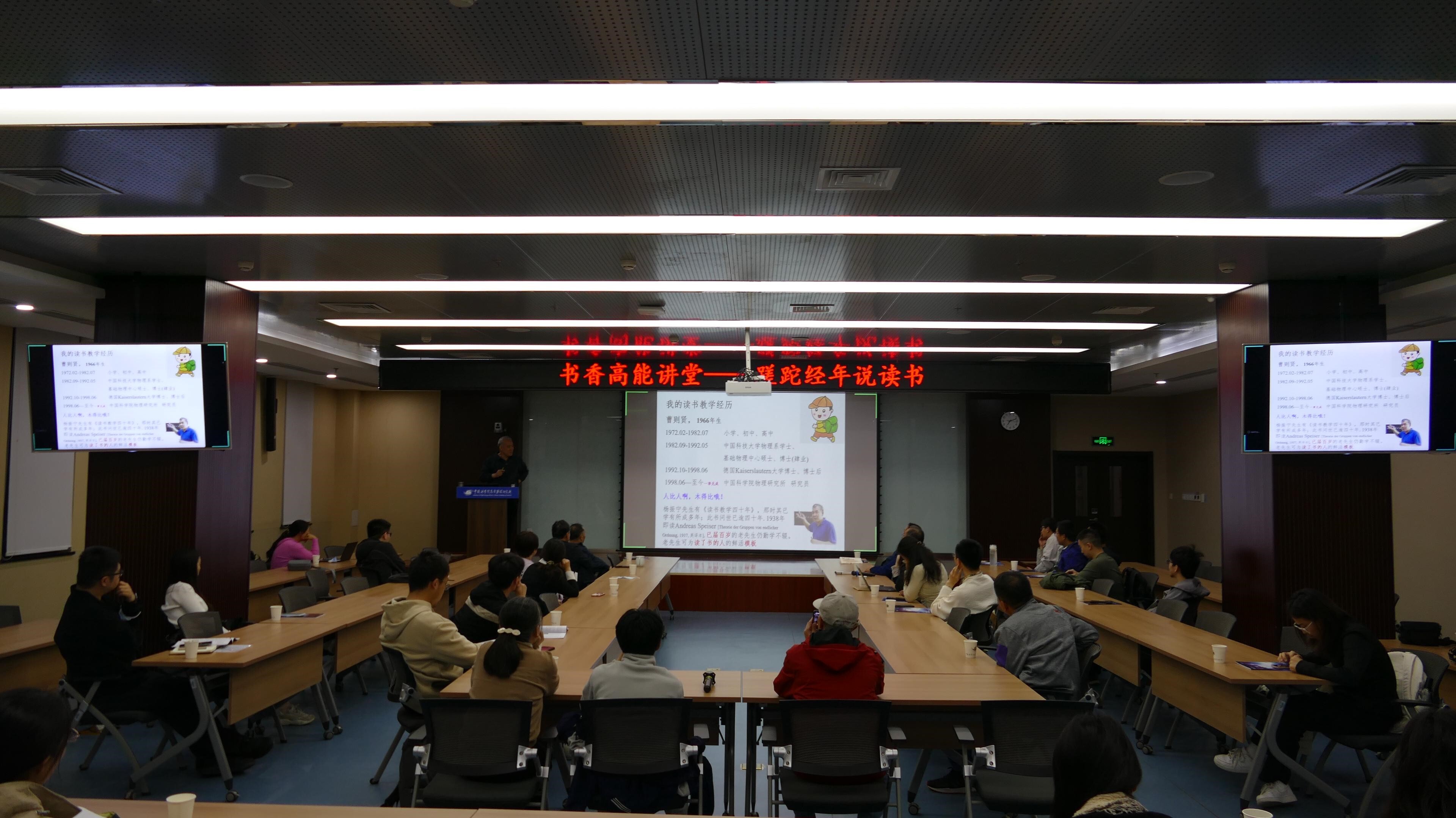 第九届4·23世界读书日系列活动——“书香高能讲堂”首场活动于2026年4月19日晚在高能所多学科大楼124会议室圆满举办。本次活动特邀中国科学院物理研究所曹则贤研究员,以“蹉跎经年说读书”为主题,为高能所师生和《现代物理知识》的线上读者带来一场跨越文理的思想盛宴,活动由高能所副所长董宇辉主持。现场主讲人妙语连珠、风趣犀利,分享内容精彩纷呈,交流氛围热烈浓厚,整场活动围绕读书展开,线上线下都感受到阅读的乐趣。