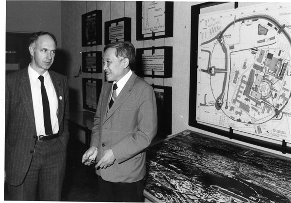 1984年,叶铭汉访问德国电子加速器研究所,与所长Soergel交谈