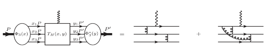 图1 核子电磁形状因子在共线因子化框架下的示意图。简单起见,展示了一个典型的LO和NLO费曼图