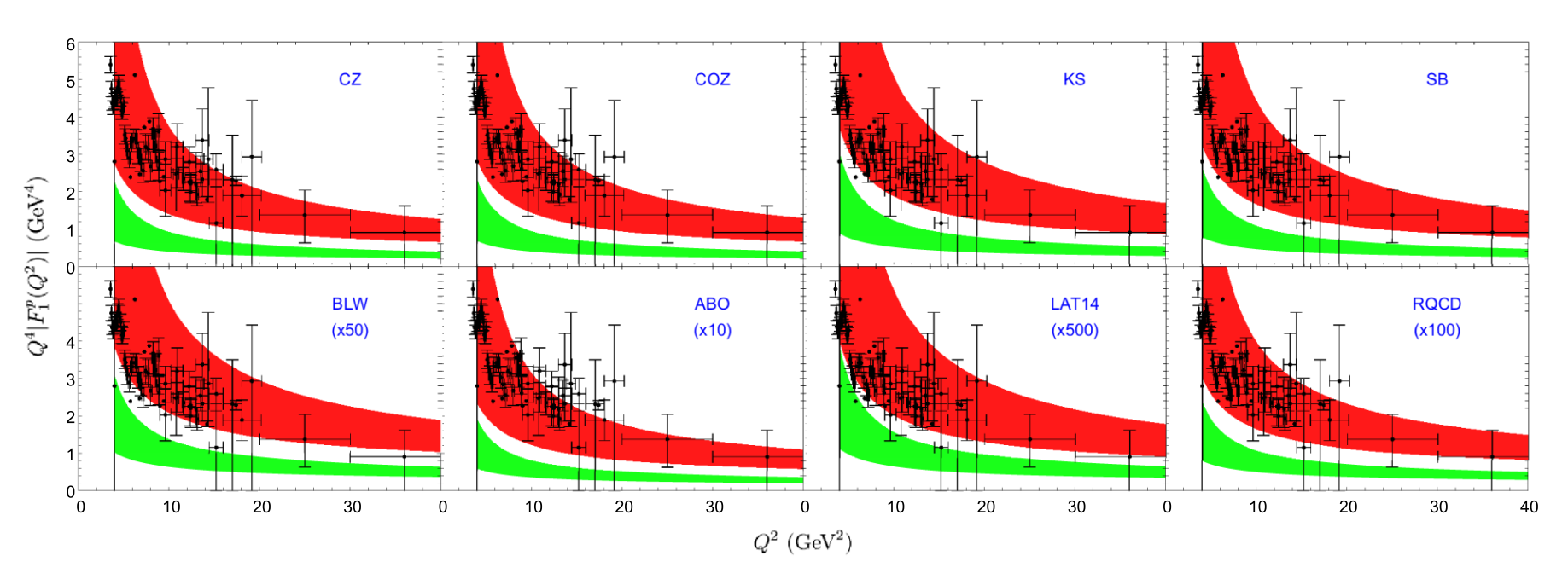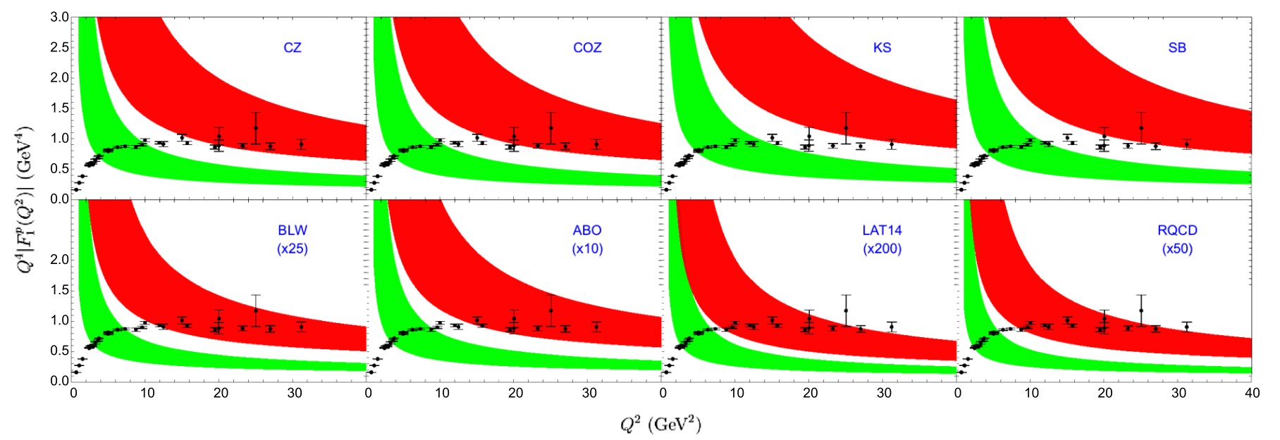 研究表明次领头阶 QCD 修正的贡献为正且效应十分显著。采用近期欧洲格点合作组提供的核子的光锥分布振幅(LCDA)作为非微扰输入,作者将核子狄拉克形状因子的NLO预言和质子与中子在类空和类时区域的大量实验数据进行对比。作者发现,即使纳入显著的NLO修正,理论预言仍比实验数据低一至两个数量级。这一发现表明,在拟筹建的电子-离子对撞机(EIC/EicC)等大科学装置可以触及的动量转移范围(Q²≈ 40 GeV²)内,仅靠微扰QCD硬散射机制可能不足以完整描述核子电磁形状因子。这些研究暗示了额外的不可因子化的软贡献或许扮演着重要角色。另外值得一提的是,如何从QCD第一性原理解释BESIII实验近期发现的核子类时形状因子的振荡行为是当前强子物理领域的一个重要疑难,其透彻解决将会有力促进我们对于非微扰QCD物理的理解。