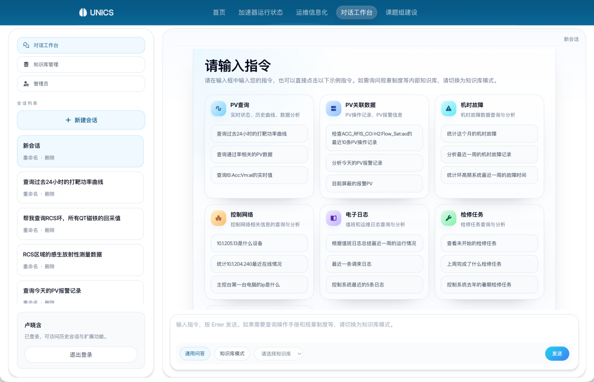 UNICS以“自然交互与智能决策”为核心理念,通过智能体技术构建高效、直观的人机交互方式,为下一代面向加速器的智能控制系统提供关键技术支撑。自2018年开放运行以来,CSNS加速器建立了信息化运维质量保障平台,得益于其所提供的强大的数据支撑,UNICS实现了对加速器实时数据、历史数据、感生放射性剂量、故障记录、检修任务、电子日志、设备数据库等多源异构数据的统一接入,并融合操作手册与规章制度等文档资源,实现跨系统数据联通与智能查询,并具备数据关联分析及辅助决策能力。目前,任务规划及交互控制处于内测与评估阶段,相关功能将在充分评估安全性与可靠性的前提下逐步开放。