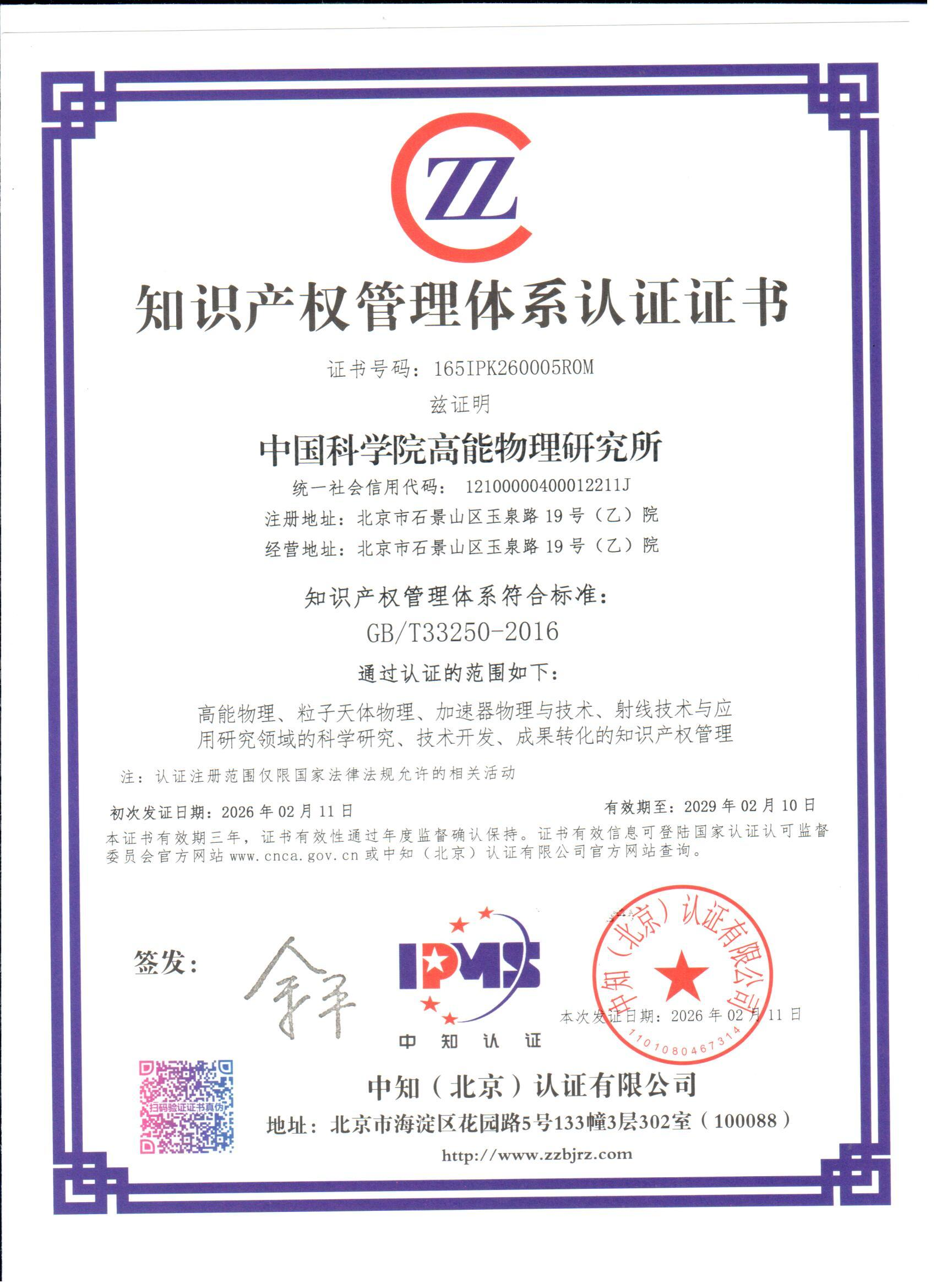 近日,中国科学院高能物理研究所正式通过《科研组织知识产权管理规范》(GB/T 33250-2016)国家标准认证,获颁由中知(北京)认证有限公司出具的认证证书。这一成果标志着高能所在知识产权创造、运用、保护和管理全链条实现系统化、规范化升级,知识产权管理工作迈入高质量发展新阶段。
